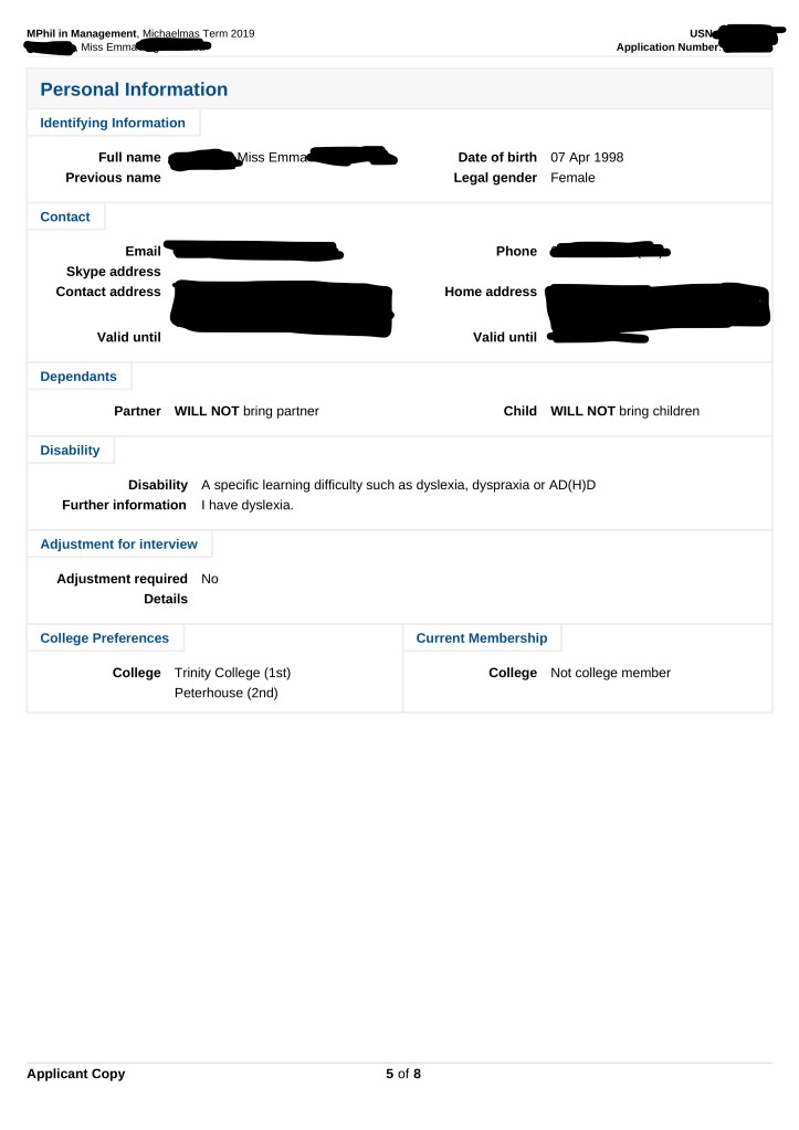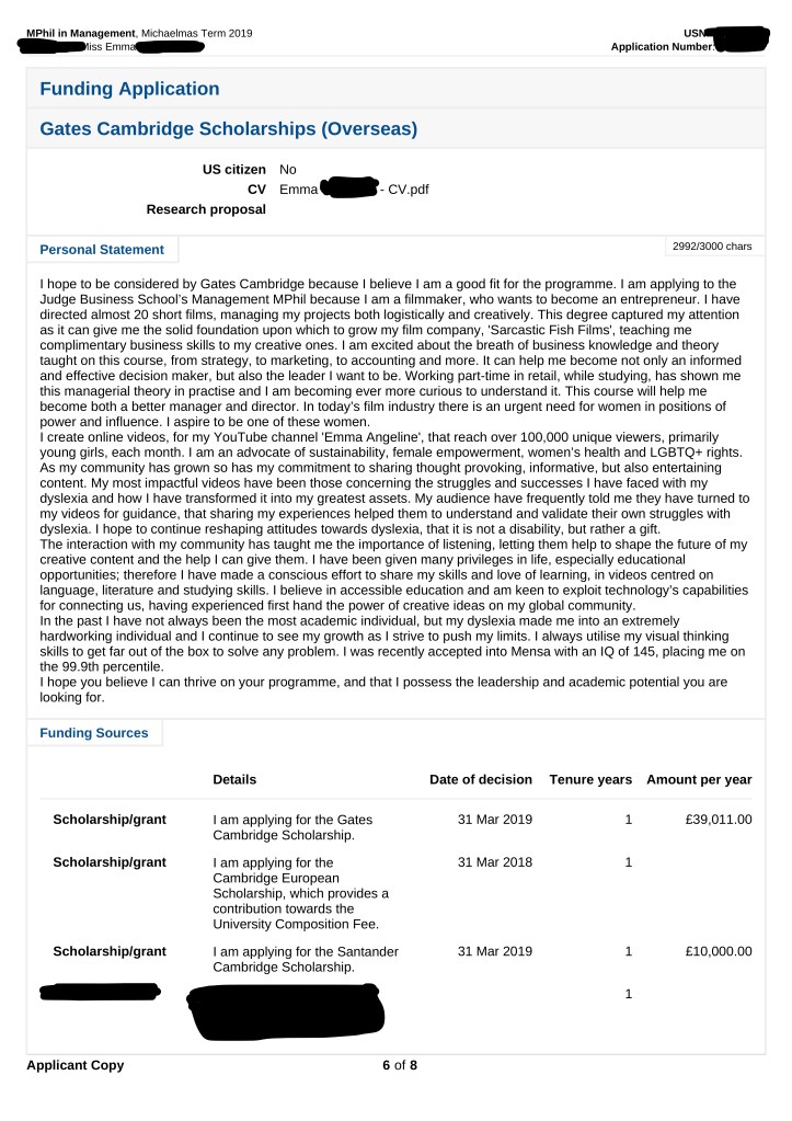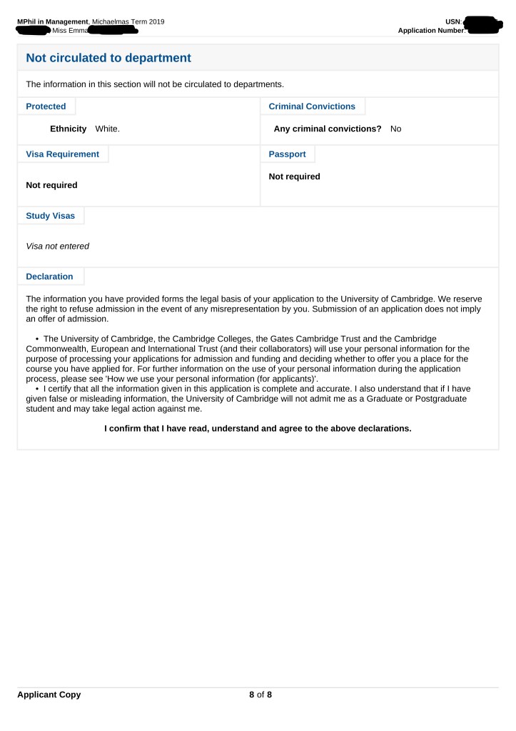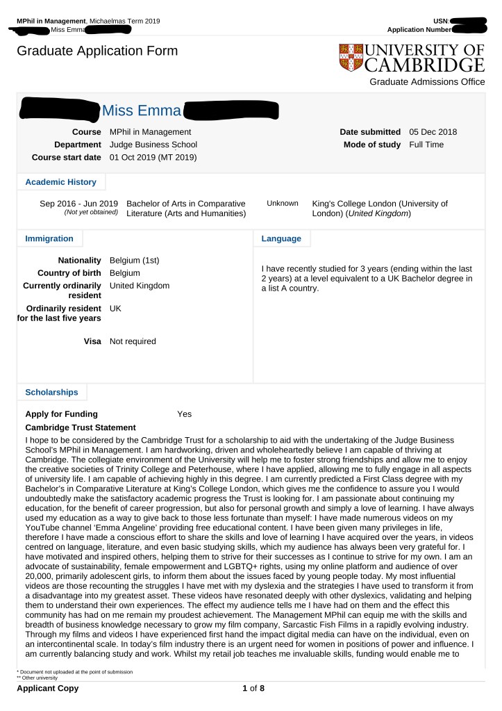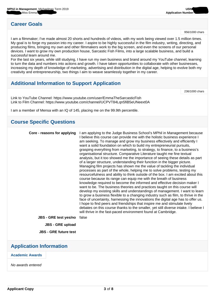 As promised I have decided to share my Cambridge application. I applied to their MPhil in Management. I am sharing this as to show you an example of the information they require from you. Please note this was an unsuccessful application, and yes, every personal statement ever written is wanky, mine is no exception. I have redacted all sensitive personal information.