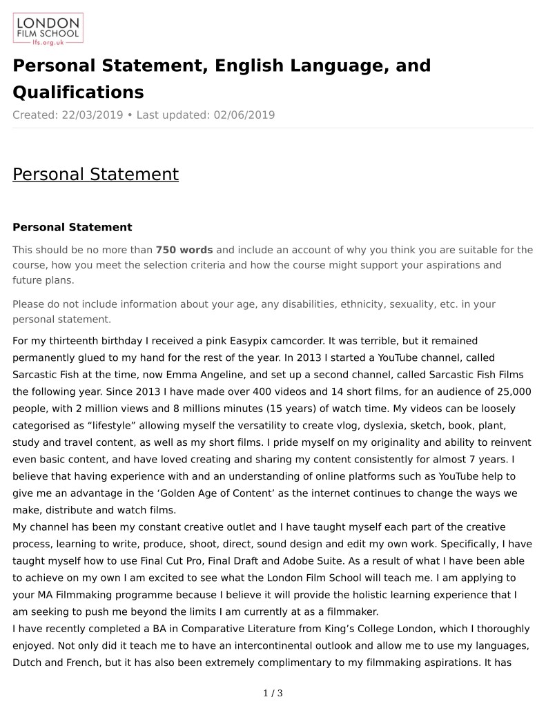 Now along a completely different vein I applied to Film School. This is a successful application. They wanted: